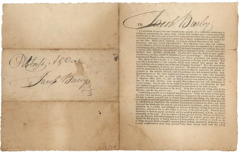 “HARTFORD CONVENTION MEN IN THEIR UNHOLY PROJECTS”WHILE PROMISING TO “PUNISH THE DECEIVERS, BUT RECLAIM THE DECEIVED”IN THE STATE ELECTIONS Partially Printed circular. Two pages, 6 ¾” x 8 ¼”. Concord, [NH]. January 19, 1829. The document reads, in part: The Object of this Circular is to solicit your aid in furtherance of the election of the candidates above named, and of the candidates for Counselors, Senators, &c. who shall be nominated by the Republican Conventions in the several districts; and of Representatives to the State Legislature. To you, Sir, we say, that an united and a vigorous effort prior to, an on the day of the next election, WILL SECURE US THE VICTORY… furnish your neighbors with all the needful and necessary information to counteract the machinations and the falsehood that may be put in operation by a corrupt and vindictive Aristocracy…For what was BENJAMIN PIERCE proscribed and hunted down in the last year’s election? Had he made himself busy against the New England President? No; this was not his sin. He refused to make himself and instrument in office to persecute his fellow republicans who had declared for Gen. Jackson- he refused to unite with federalists and Hartford Convention men in their unholy projects- he refused to join a cabal of office seekers who has sold themselves to the federal party; and therefore he must be immolated to the altar of party…If we all do our duty on the second Tuesday of March, there cannot be doubt of complete success…On that day, let the watchword of Republicans be, Reform in our State administration: on that day, let our motto be -“Punish the deceivers, but reclaim the deceived!”
