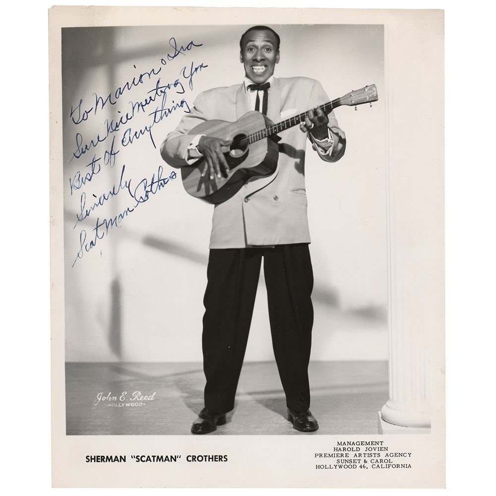 Vintage semi-glossy 8 x 10 agency photo of Crothers with an acoustic guitar, signed and inscribed in fountain pen, "To Marion & Ira, Sure nice meeting you, Best of Anything, Sincerely, Scatman Crothers.†In fine condition, with a few small surface creases.
