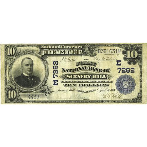 <B>Scenery Hill, PA</B></I> - $10 1902 Plain Back Fr. 624 <B>The First NB</B></I> Ch. # (E)7262<BR>This Washington County issuer bears one of the great names on a National Bank Note. Just nine large notes are included in the census from this always in demand locale. The supply of Nationals with unusual town names or bank titles is always under pressure from the growing number of buyers captivated by the collecting allure they offer. <B>Fine.</B></I>