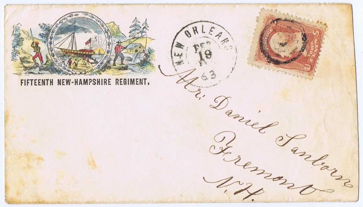 Delightfully charming hand-colored patriotic, "Fifteenth New-Hampshire Regiment," with unusually pictorial montage of a Navy ship docked at a wharf, men on the pier, flanked by a barefoot spear-fishing Indian, with a red three-feather headdress, and a white man fishing with rod, a water-powered mill in background. Both scenes evidently evoking home - New Hampshire. Scott #65, a more intense rose, not shown in McClung, very wide margin at top, generous at sides, in at bottom. With single-circle cancel, and occupied New Orleans c.d.s., Feb. 19, (1863). To Daniel Sanborn, Fremont, N.H. Both David and Joseph Sanborn, Jr. of Fremont served, the former a Pvt. in the 15th, the latter in the 11th N.H. Infantry, wounded at Poplar Springs Church, Va. in 1864. Some pocket stains at blank lower left and upper right, postal wear, else good plus, and one of the prettiest patriotics we have seen in some time.