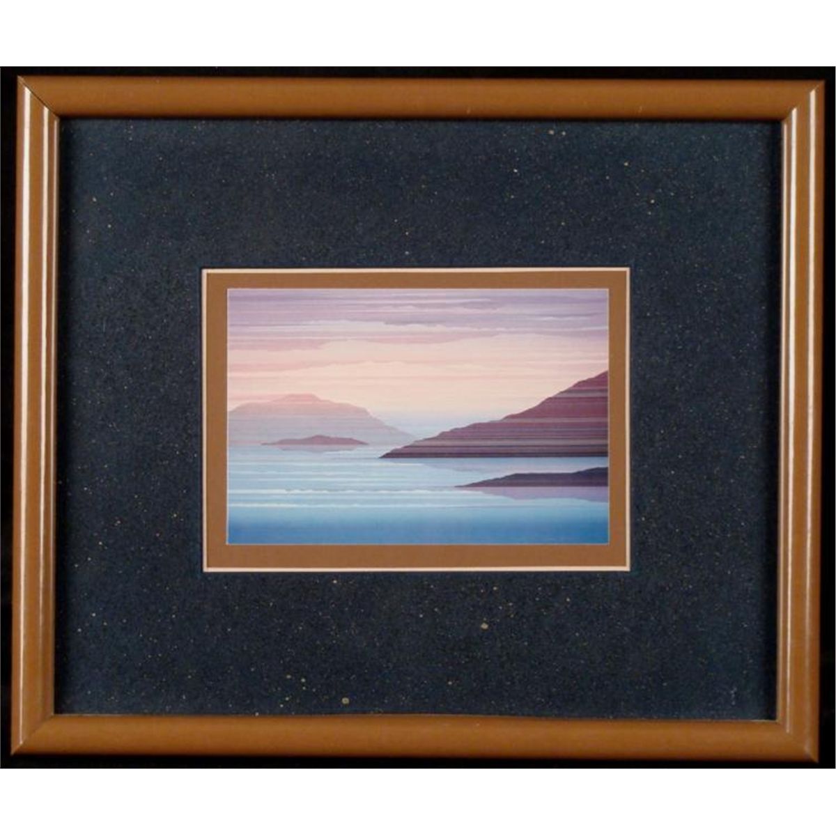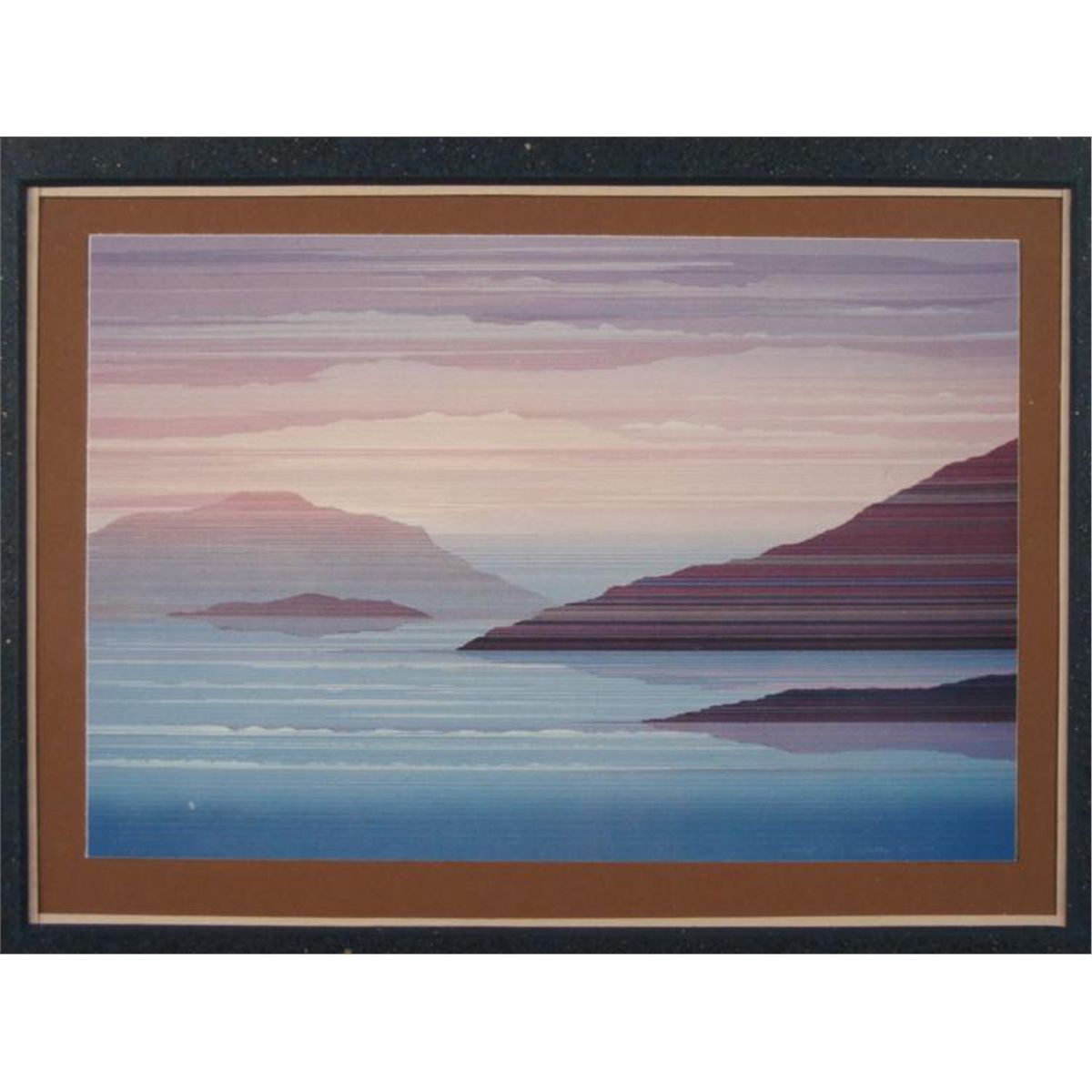 This print portrays the land and islands at the edge of a misty ocean. The horizontal lines give it a modern style, with sharply detailed array of subtle colors. * Image size: Approximately 4 x 6 1/4 inchesMedium: Lithograph on paper * Presentation: Triple matted in brown, white and black flecked with gold, in a brown laminate frameFrame size: 11 x 13 inchesCondition: Excellent
