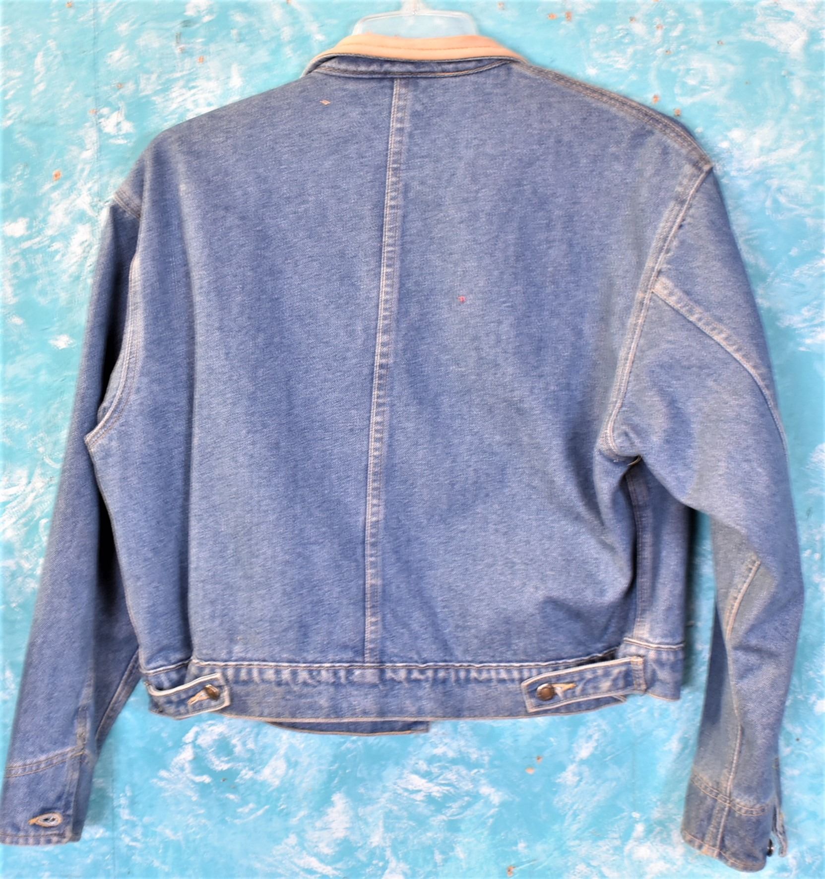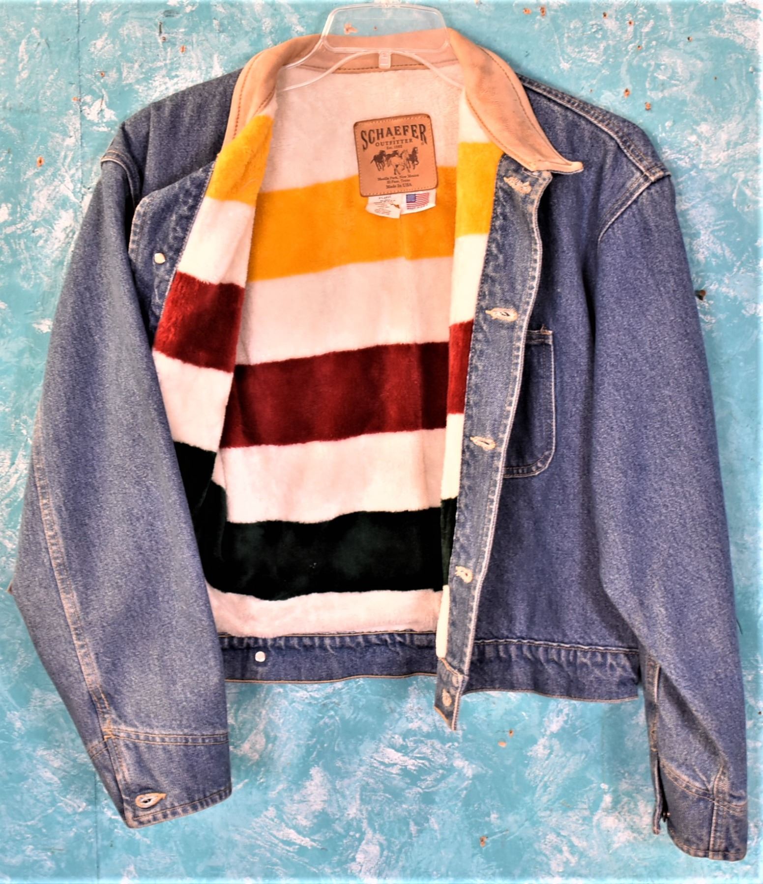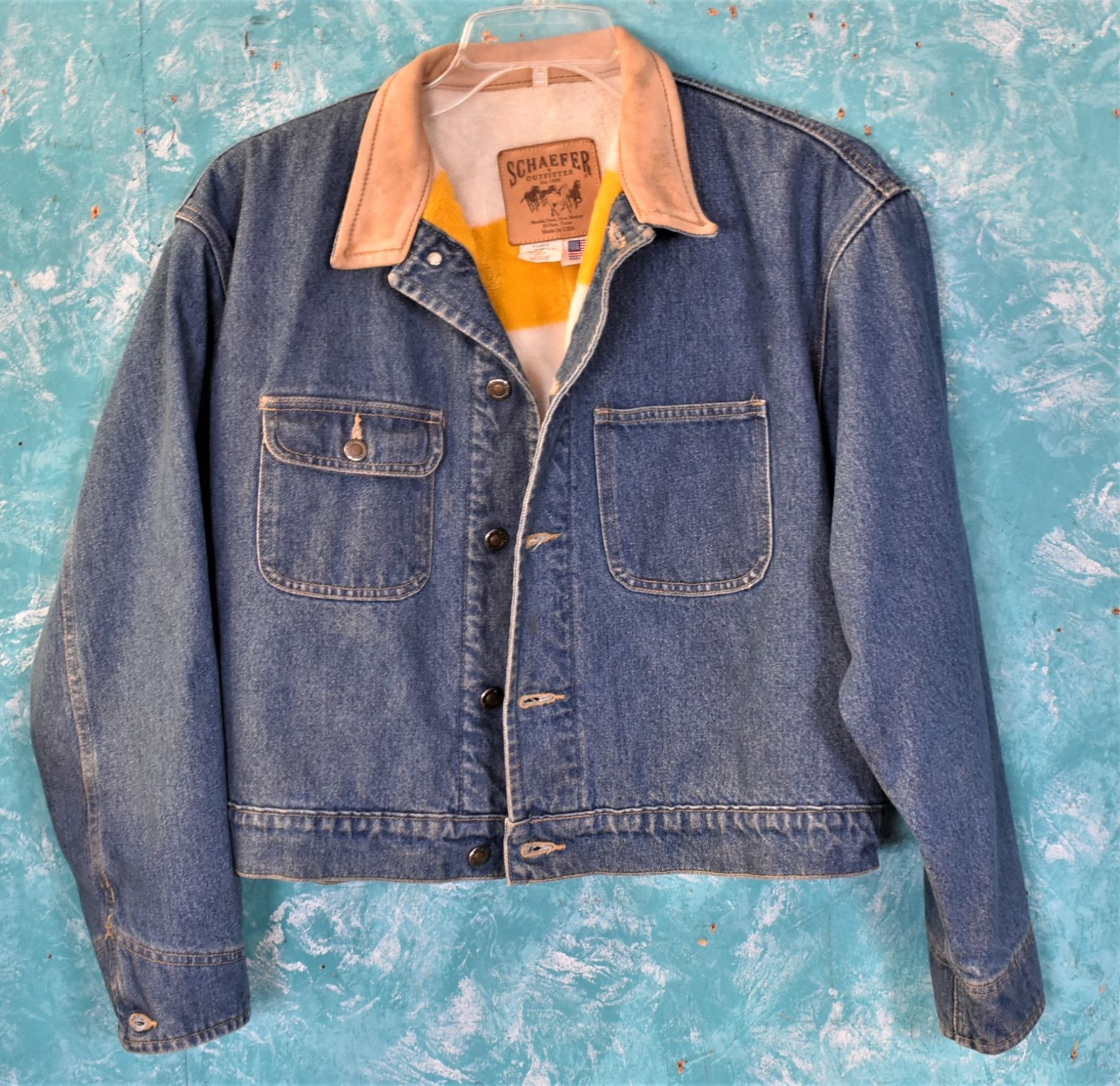 Schaeffer Outfitters Denim Jacket, Size XL, shell 100% cotton, body lining 100% nylon, made in the USA, Mesilla Park NM and El Paso TX