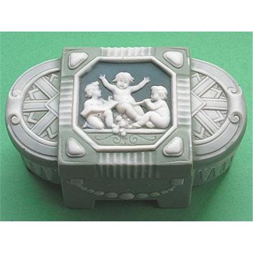Schafer & Vater produced this outstanding sage green jasperware dressing table jar circa 1900. The lid features, in detailed bas-relief, three froliking cherubs against a teal green background and surrounded by geometric decorations. The base is adorned, on both the front and back, with more Art Nouveau ornamentations. Measuring 4 1/2 inches long x 2 1/2 inches deep x 2 1/2 inches tall and is marked on the bottom with the Schafer and Vater crown and the number 2899 This very lovely piece of old delicate jasperware pottery is in excellent condition.