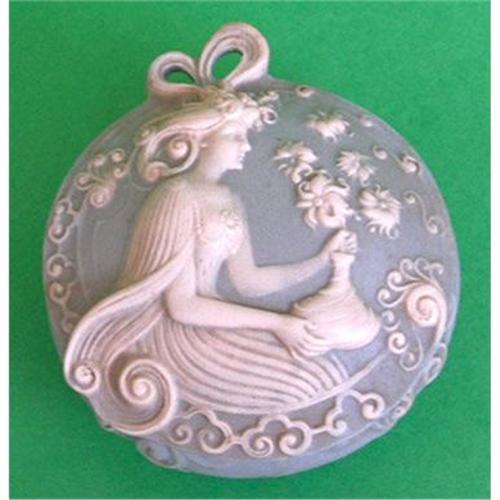 Schafer & Vater produced this pale blue jasperware powder or dresser jar circa 1900. The ornate lid features a pretty girl, Genie in flowing Persian dress holding a bottle - copious ornamentation, all in pink bas-relief, scattered about completes the decoration. The base is similarly decorated. The bottom is marked with the number 3860. Measuring 3 1/2 inches in diameter x 2 1/2 inches tall and is excepting, what appears to be a small nick or manufacturing flaw below the rim of the base, this old and very delicate cameo jasperware vanity jar is in excellent condition.