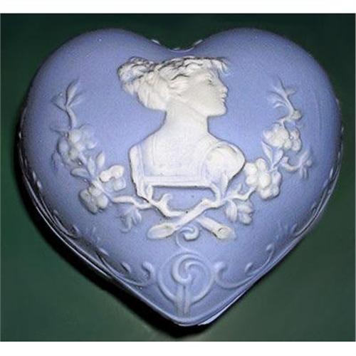 This heart shaped blue Jasperware powder or trinket jar was produced by Schafer & Vater during the early years of the 20th century. Featuring, in white bas-relief, the cameo bust of a lovely Victorian maiden. The lid is further adorned with sprigs of flowers in a semi-circle around her - scrollwork borders both lid and base. Measuring 3 3/4 inches x 4 inches and is in excellent condition. The number 6563 is incised underneath