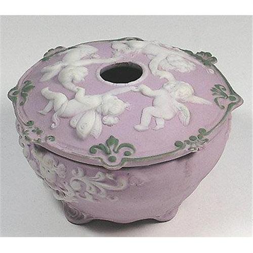 This lavendar Jasperware Art Nouveau round and footed Schafer & Vater hair receiver features a lid with four symmetrically placed winged cherubs, frolicking and holding hands. The lid is further decorated with a frieze of green fan like ornaments. The base is adorned with an angelic cameo surrounded by fancy scrollwork above lavendar jasperware background. Marked with the number 37 above the S & V number 3691, measures 3 inches tall x 4 across and, with the exception of two nicks on the rim of the base, is in excellent condition.