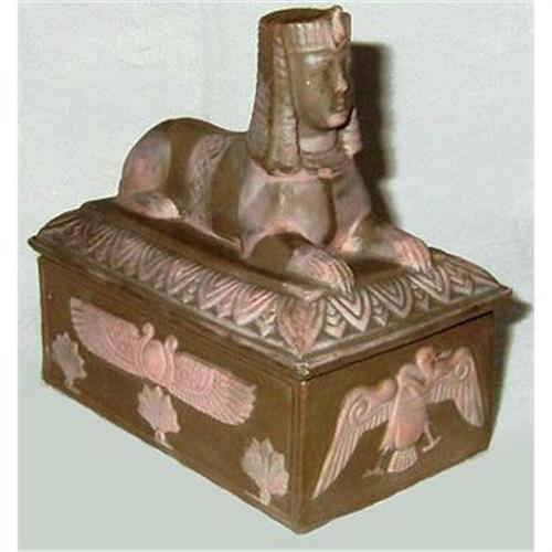 This chocolate brown and pink colored jasperware Egyptian Revival rectangular vanity box was produced by Schafer & Vater, during the early 20th century The lid features a large finial in the shape of the Sphinx - the edge is decorated with ancient Egyptian ornaments. The base is adorned with large predatory birds and, on two sides, rows of three trees. Measuring 4 ¼ x 2 ½ inches and is 4 ¼ inches tall. Both the lid and base of this very rare dresser jar is in excellent condition