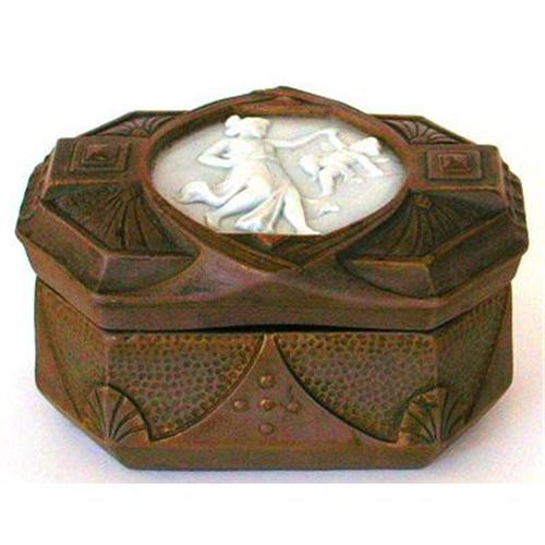 Produced by Schafer & Vater, circa 1900, this dark green or brown Art Nouveau jasperware vanity box depicts, on the lid, a detailed bas-relief cameo of a young lady holding hands and dancing with a winged cherub in white. The lid is additionally adorned with assorted Art Nouveau ornamentation as is the base. Measuring 5 inches long x 3 3/4 inches deep x 3 1/4 inches in height. The bottom is marked with the number 6684 and the Schafer & Vater crown. This very lovely piece of delicate old Schafer & Vater jasperware pottery is in excellent condition