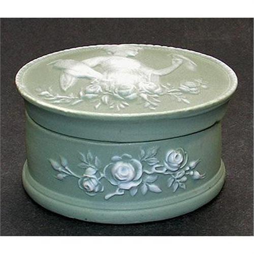 Schafer & Vater produced this sage green jasperware powder or dresser jar circa 1900. The ornate lid features a pretty girl, in flowing Grecian dress and hair style, holding a Grecian urn, tucked under her right arm, and a Falcon or Parrot perched on her left hand - sprigs of roses border below and all in detailed bas-relief. The base is decorated with three sprigs of roses Measuring 3 1/2 inches in diameter x 2 3/4 inches tall and is The bottom is marked with the number 3093 and the S & V crown, if present, is to faint to discern. Excepting, what appears to be, two minute manufacturing flaws, this old delicate cameo jasperware vanity jar is in excellent condition.