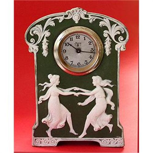This green Jasperware clock features dancing maidens with flowing robes and bare feet, in detailed white bas-relief and. beneath swirling rococo swags and garlands of flowers . Framed in silver metal above the dancing damsels is a round clock. The piece is about 7 inches tall. On the back is the faint outline of the Schafer mark and the number, 9562. The bisque is excellent and the overall modeling is sharp and detailed. The clock is marked on its face Newport and British Made. I do not know if the clock works as the knob is missing to wind it. But there is not any damage to the bisque or bas-relief