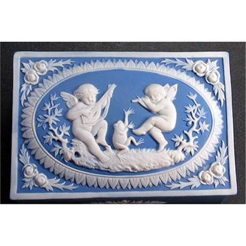 This German Jasperware dresser box, surely produced by Shafer & Vater, features, in white bas-relief, cherubs, a dancing frog and flowers on a blue bisque ground. Stamped Germany and the number 9393 underneath. Measuring about 5 inches x long 3 inches wide x 2 1/2 inches tall and is in excellent condition.