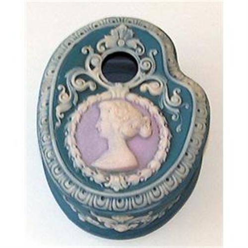 </font></strong>This delicate blue Schafer & Vater Jasperware hair receiver features, in detailed cream bas-relief, a cameo of a Victorian lady against a lilac pink background and with additional decoration scattered around the lid and jar. This irregular shaped jar measuring about 4 inches long x 3 inches wide x 2 inches tall. Incised on the bottom are the numbers 1198 and the Schafer & Vater crown. Both the jar and its lid are in excellent condition.</font>