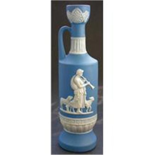 </font></strong>Produced by Shafer & Vater, circa 1920. This ornate Art Nouveau blue jasperware vase features, in white bas-relief, an ancient Grecian shepherd walking with his flock and playing his horn. The vase is further adorned with classically ornamented borders, a handle and other period decorations. Measures 8 1/2 inches tall x 2 1/2 inches across the base ? imprinted faintly with the number 8208 and is in excellent condition</font>