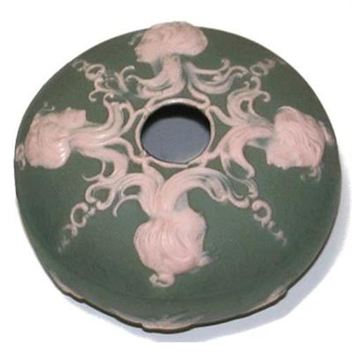<table width="100%" border="0" cellspacing="0" cellpadding="4"><tr><td><em> </em></td></tr><tr> <td width="100%"> This beautiful round jasperware Art Nouveau Schafer & Vater hair receiver features four symmetrically placed ladies' heads interspersed with fancy scrollwork - all in pink bas-relief and against a blue/green jasperware background. The base is adorned with six birds in flight also in pink and against a blue/green jasperware background. Marked faintly with the Schafer & Vater crown and the No. 3326, measures 2 " tall x 31/2" across and is in excellent condition. </td></tr><tr> <td> </td></tr><tr> <td>Reference #: aaSVGP4LJHR1_</td></tr><tr><td>Condition:Excellent</td></tr><tr><td>Year:Early 1900s</td></tr><tr><td>Title:Schafer & Vater Jasperware Hair Receiver </td></tr><tr><td>Location:Orlando, Florida</td></tr></table>