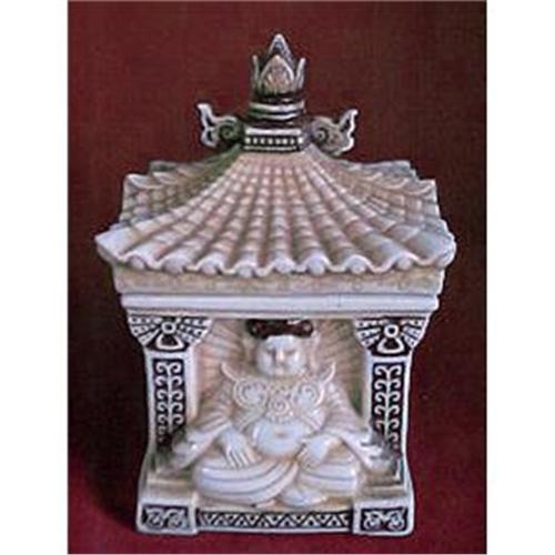 Produced by SCHAFER & VATER during the early 20th century. Shaped like a temple with a Buddha sitting on the front, a whimsical animal on the roof and dragons in detailed bas-relief on the sides.. Measures 4 1/4 inches tall 3 x 3 1/2 inches across the base and is in excellent condition.