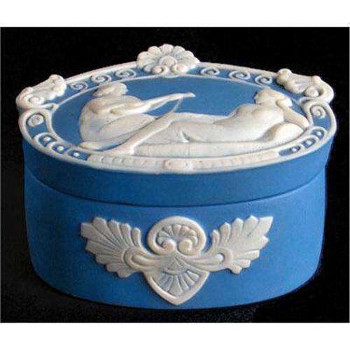 Produced by Schafer & Vater this exquisite oval blue jasperware dresser jar, circa 1920s, depicts in detailed bas-relief a lute player serenading a classical lady, wearing a diaphanous Penoir, reclining on a caise lounge. The lid is further adorned with fancy bas-relief Art Decoesque ornaments, curlicues, etc. as is the base. Measuring 4 inches long x 3 inches across x 2 inches tall and is marked on the bottom with the Schafer and Vater crown but the number is to faint to discern. This very lovely piece of old delicate jasperware pottery is in excellent condition