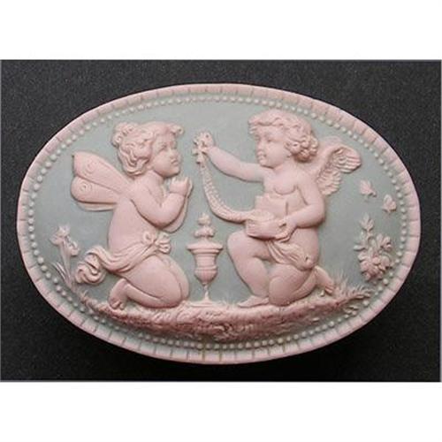 Produced by Schafer & Vater, circa 1900, this exquisite oval pastel blue jasperware dresser jar, features on its lid, in detailed bas-relief, two pale pink winged cherubs one praying over an urn - the other pulling a cross attached to a pearl necklace from a trinket box. The lid is further adorned with flowers, other flora, butterflies and a beaded border. The base has sprigs of matching flows on its front and back. Measuring 4 1/2 inches long x 3 1/2 inches deep x 2 1/2 inches in height. The bottom is impressed with the number 3407. This very lovely piece of delicate old Schafer & Vater jasperware pottery is in excellent condition