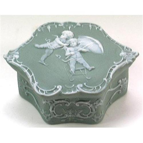 This slate green Schafer & Vater Jasperware powder jar was produced during the early 20th century. The lid features in detailed white bas-relief, a pair of cherubs - one skating - one sledding while holding an umbrella. Fancy scrollwork adorns the border of the lid and the jar. Measuring about 3 3/4 inches x 3 inches x 1 3/4 inches tall. Incised on the bottom are numbers. Both the jar and its lid are in excellent condition.