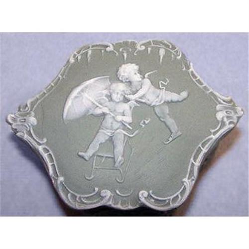 This slate green Schafer & Vater Jasperware powder jar was produced during the early 20th century. The lid features in detailed white bas-relief, a pair of cherubs - one skating - one sledding while holding an umbrella. Fancy scrollwork adorns the border of the lid and the jar. Measuring about 3 3/4 inches x 3 inches x 1 3/4 inches tall. Incised on the bottom are numbers. Both the jar and its lid are in excellent condition.