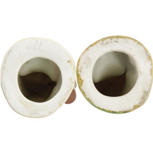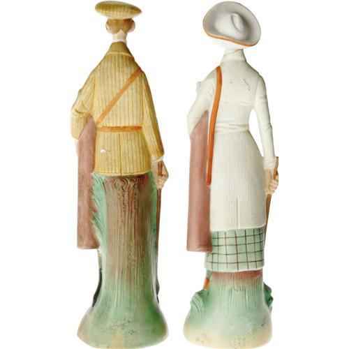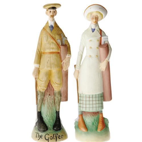 <B>Schafer and Vater Porcelain Golfers.</B></I> A comical pair of pigeon-toed figurines depicting a sporting couple decked out in early 20th century golfing regalia. Hand-painted German porcelain, 7.625" high. The gentleman is intact, however his lady has been broken at the neck and nicely repaired.