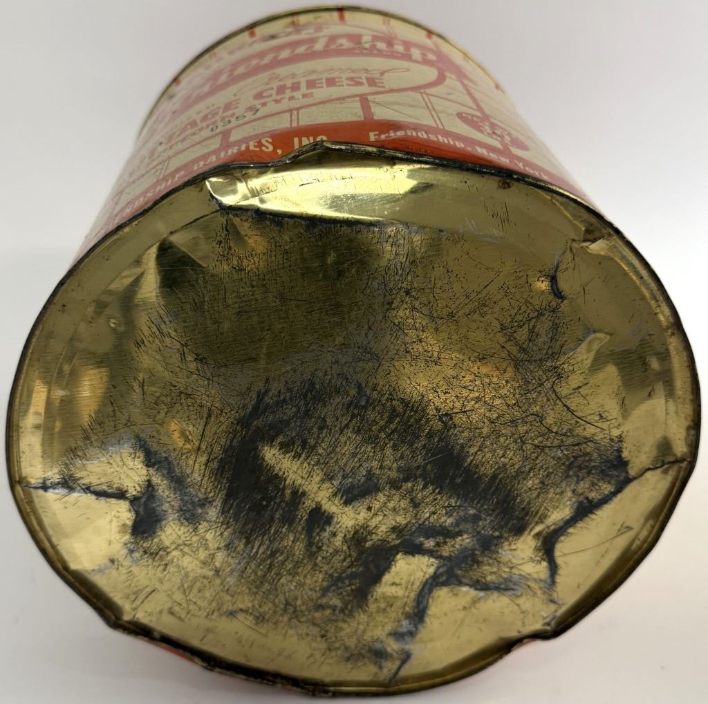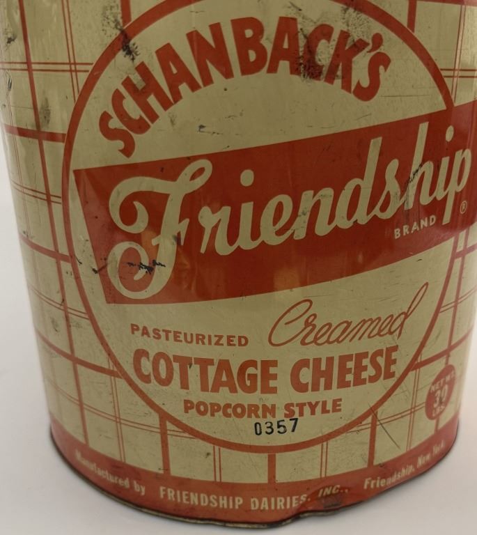 Item/Description: Vintage Schanback's Friendship Dairies Inc. Cottage Cheese Popcorn Style advertising tin can from the mid-20th century.