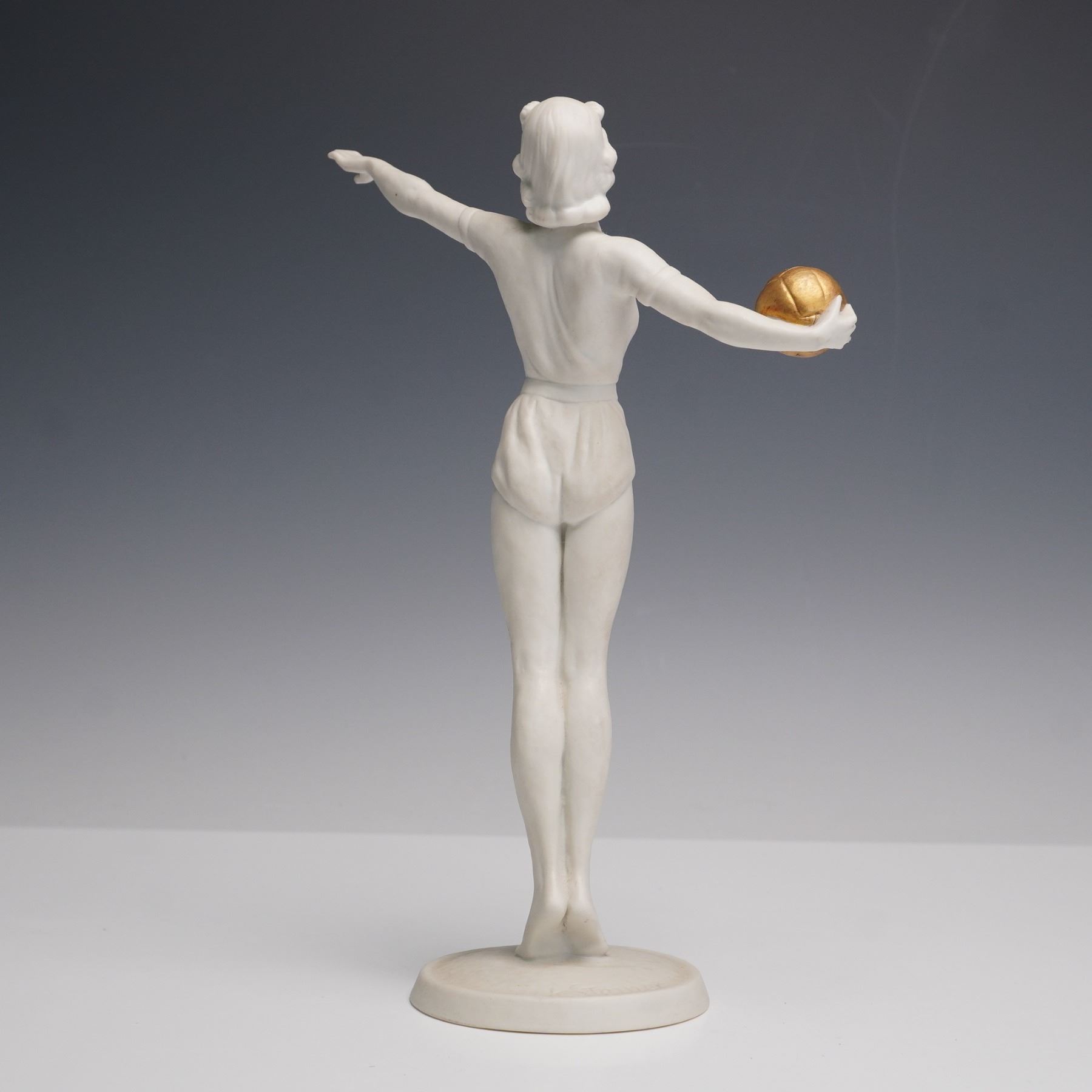 A finely modeled Schaubach Kunst bisque porcelain figurine depicting a female volleyball player in athletic pose, holding a gilt ball in one hand with the other arm raised. The matte white surface highlights the detailed modeling, while the ball is accented with gold. Signed K. Steiner to the base and bearing the Schaubach Kunst backstamp with impressed model number 1285/I.