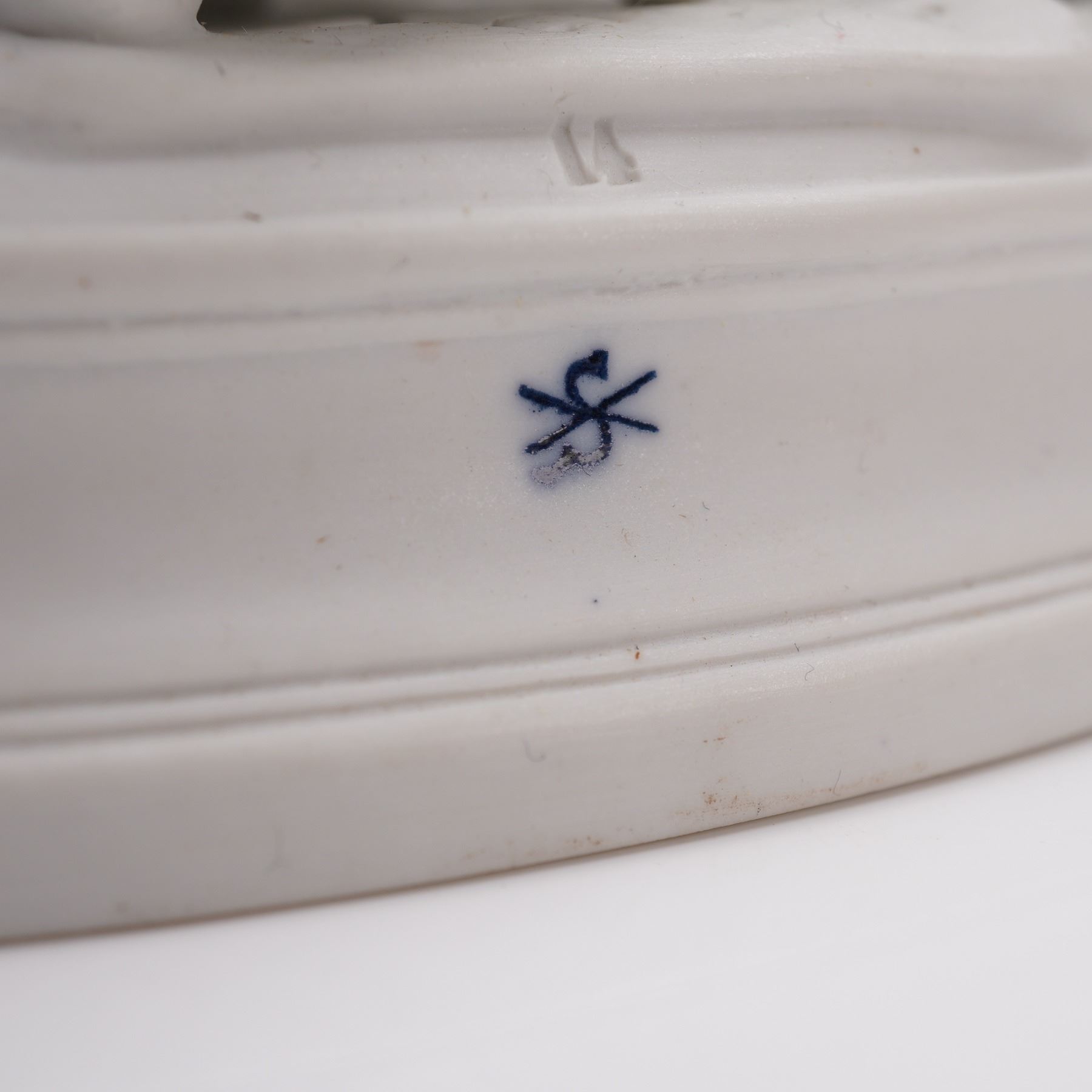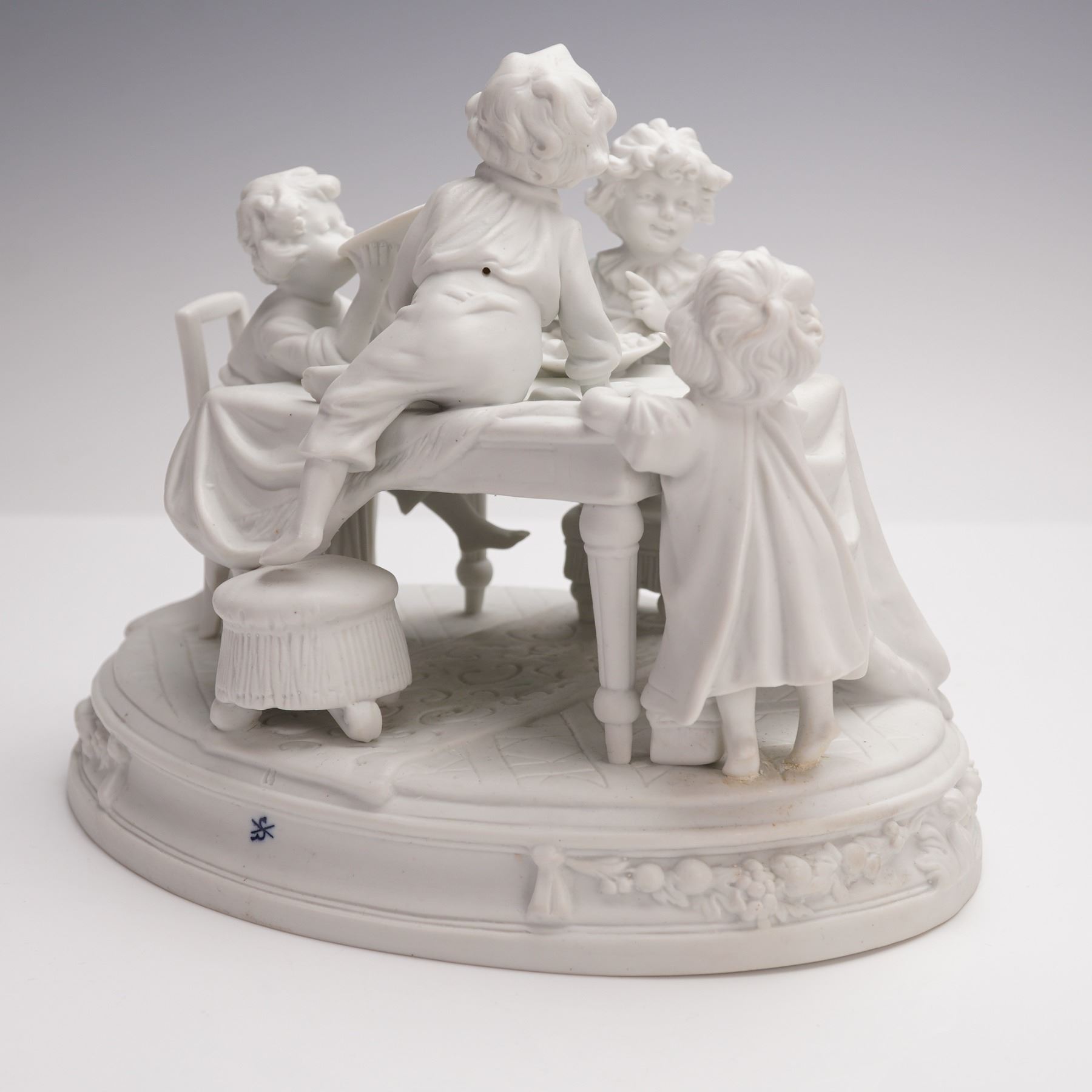 The finely detailed group shows the youngsters engaged in lively activity, with one child perched on a chair, another reaching across the table, and others enjoying food and drink. The scene rests on a circular base with molded fruit and floral garlands in relief. The underside bears the Scheibe-Alsbach blue crossed "S" mark.