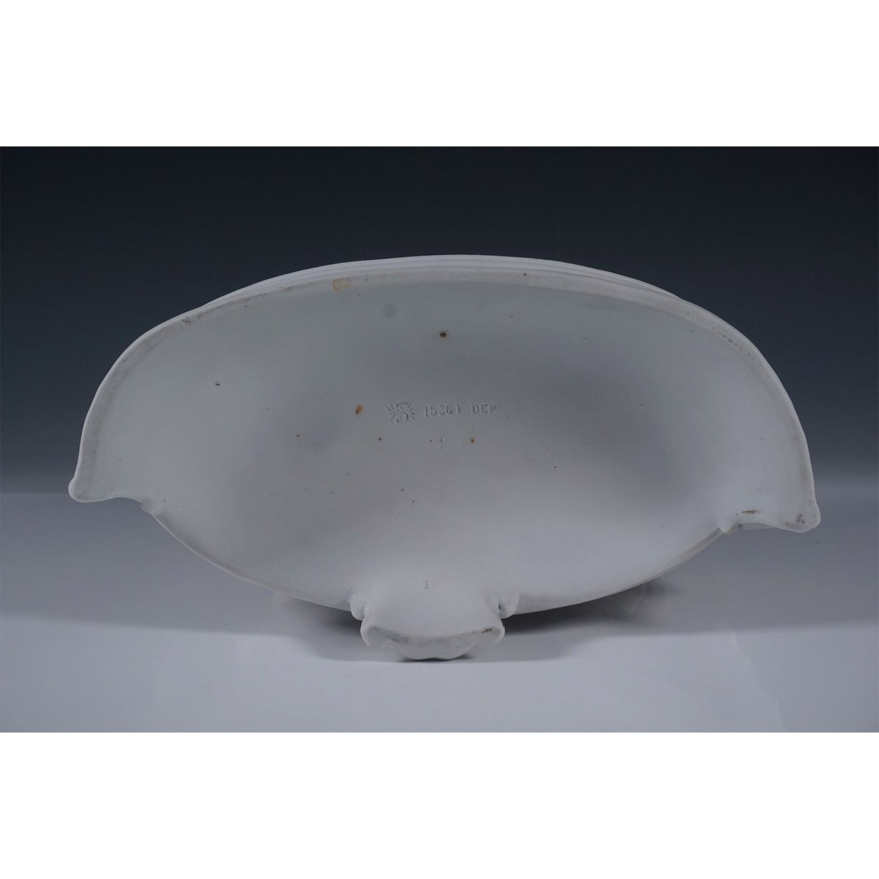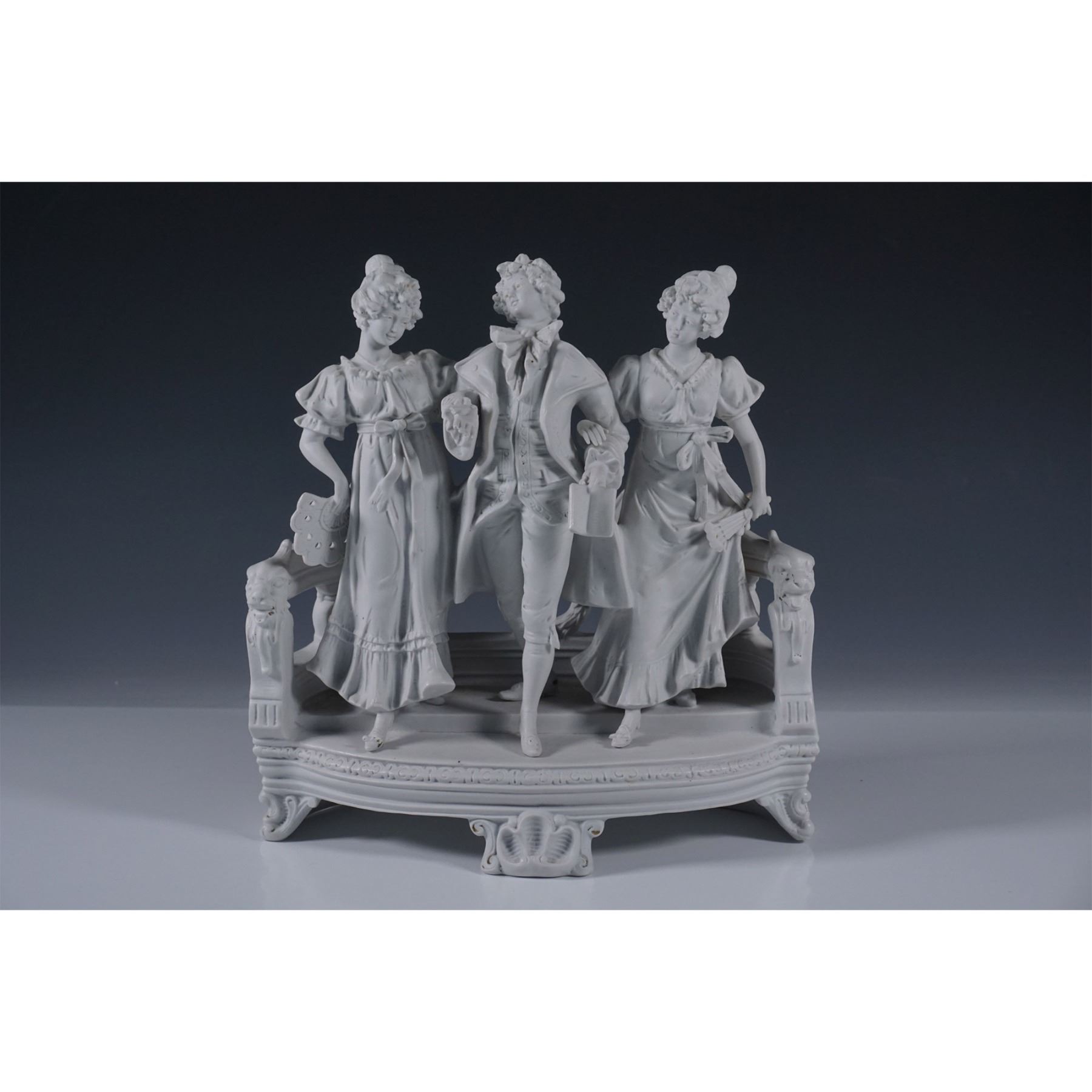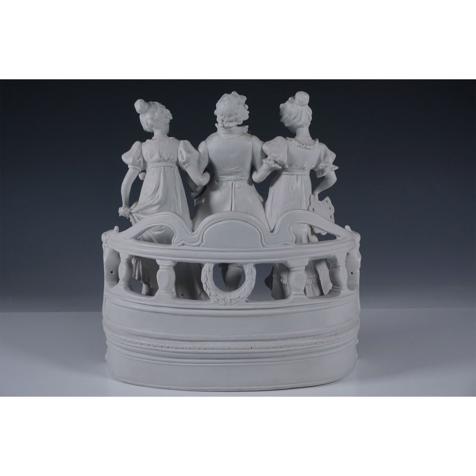 Exquisite bisque porcelain figurine depicting an 18th-century courting scene. This finely detailed piece showcases a gentleman escorting two elegantly dressed ladies across an ornate platform adorned with balustrades and decorative elements. The craftsmanship highlights intricate facial expressions, flowing garments, and period-accurate accessories. The underside bears an impressed S mark with numerals for Scheibe Alsbach. A beautifully sculpted representation of European porcelain artistry.