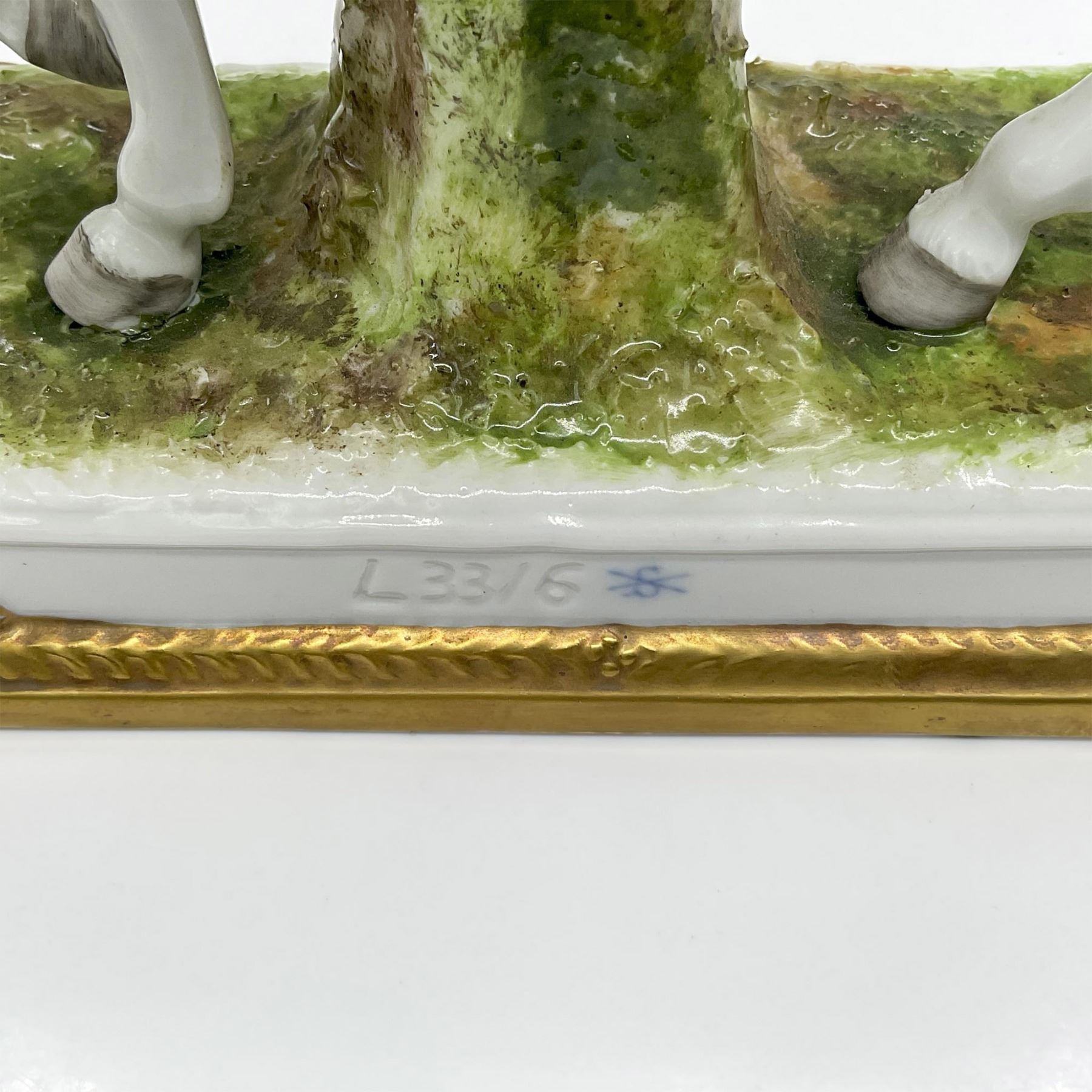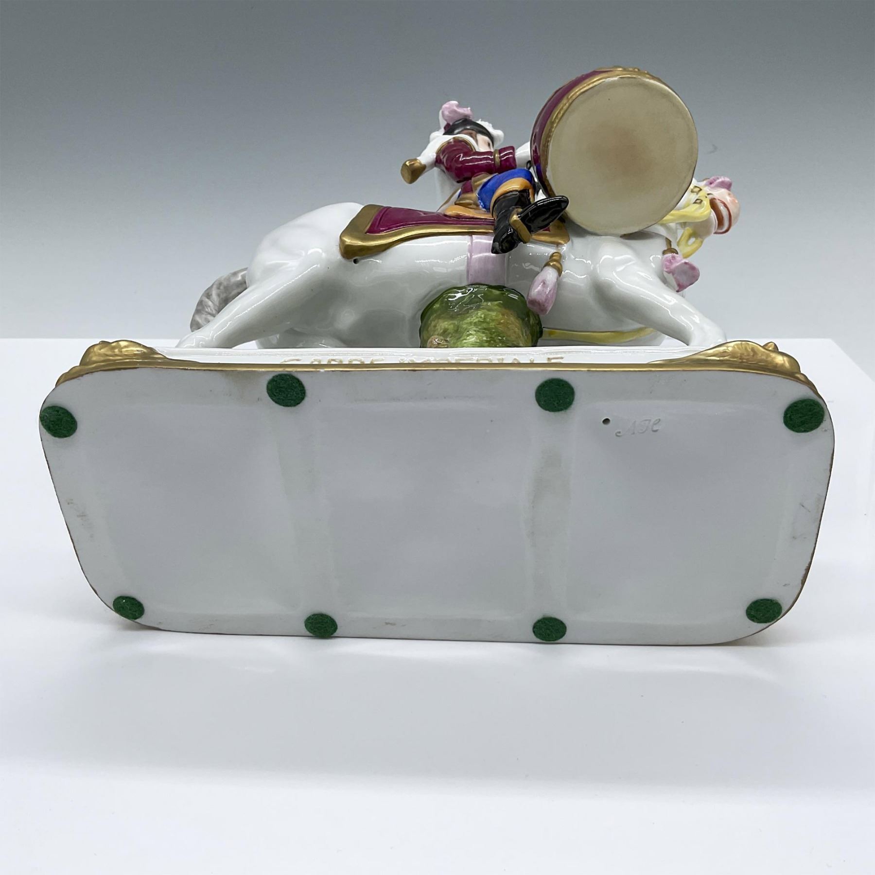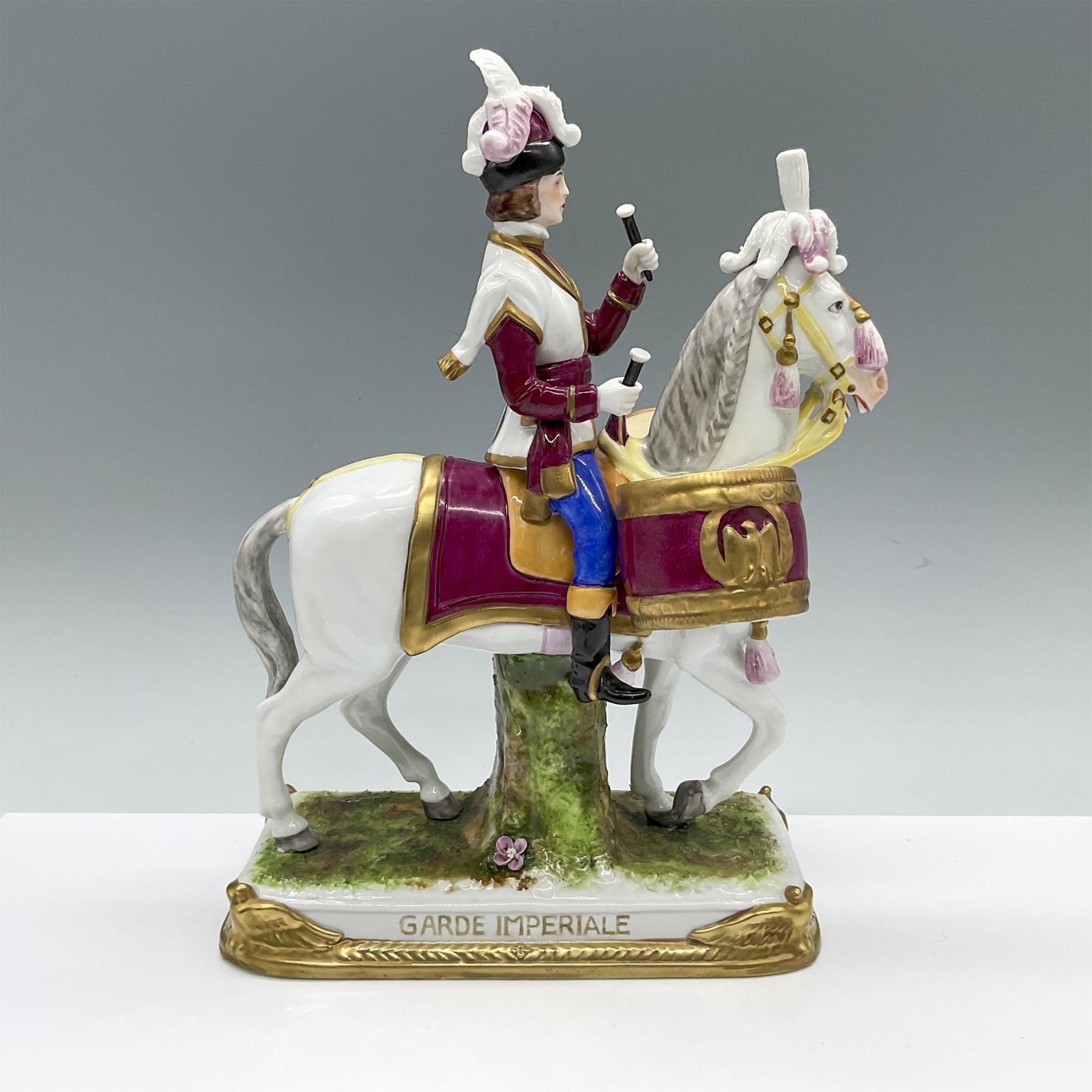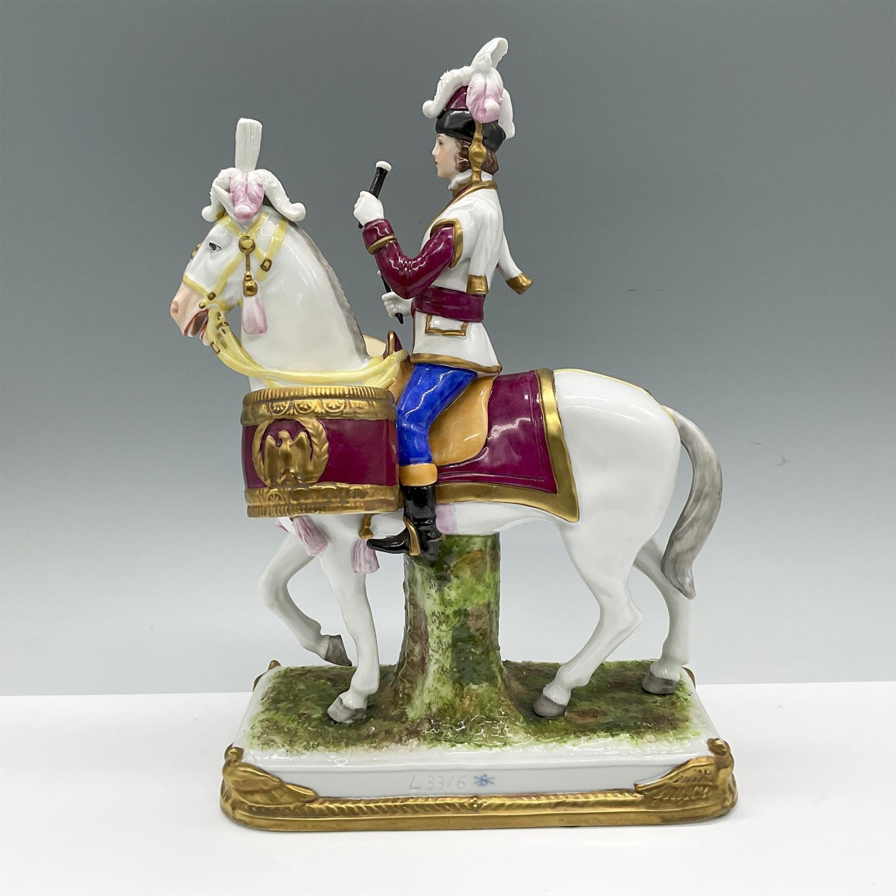 Hand decorated of a military drummer. He is depicted on a white decorated horse with two large snare drums. Magenta, white, orange, blue, and gilded colorations. The figure possible inspired by Eugene Leliepvre (French, 1908-2013) illustration, Garde Imperial Grenadiers a Cheval. Garde Imperiale marked on the front. Marked Scheibe-Alsbach and L33,6 on the base.