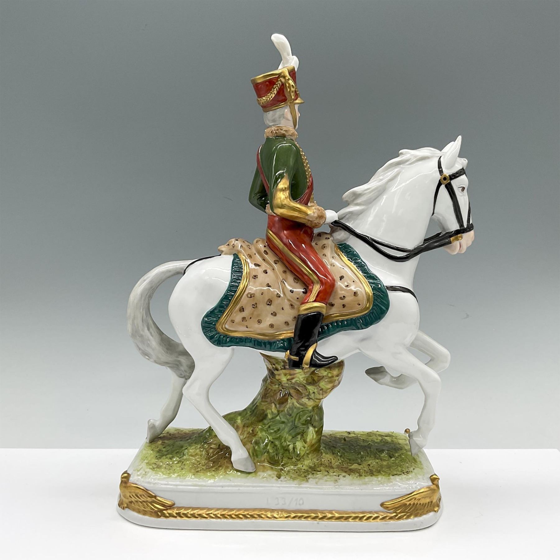 Hand decorated figure of Charles Joseph Randon de Pully, a French general of noble birth. The figure depicts the French general in a green and gilded dress uniform, riding a white horse. The figure is inspired by Victor Huen (French, 1874-1939) illustration of Charles Joseph Randon de Pully. Pully impressed on the front of the base. L33, 10 marked on the other side. Scheibe-Alsbach backstamp.