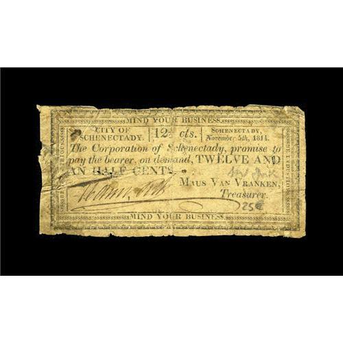 <B>Schenectady, NY- City of Schenectady</B></I> 12 1/2¢ Nov. 5, 1814 Harris UNL<BR>A very rare upstate New York War of 1812 issue with this denomination unlisted in the Harris reference. <B>Very Good</B></I> in appearance, but reinforced with hinges on the reverse.<BR><BR><b>Shipping:</b> Coin/Currency (<a target="_blank" href="http://www.heritageauctions.com/common/shipping.php">view shipping information</a>)
