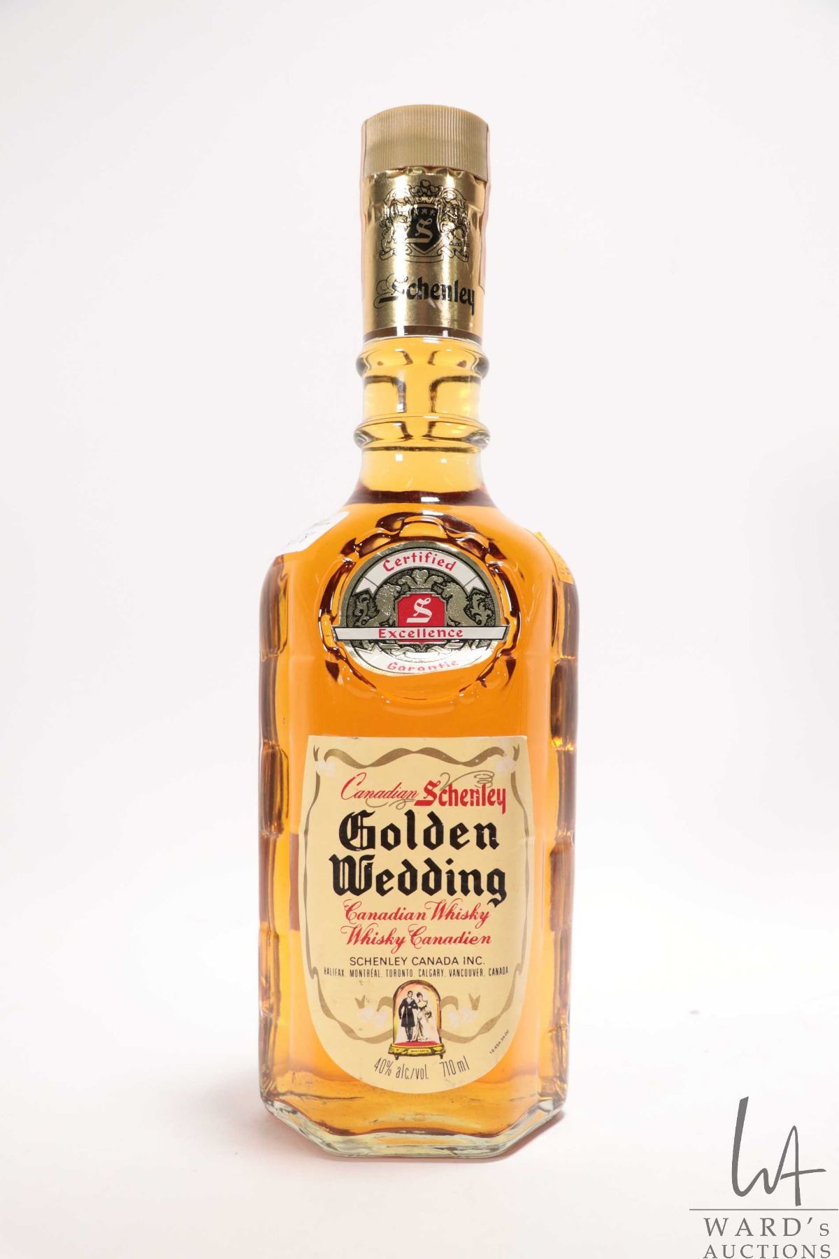 Schenley/ Golden Wedding Canadian Whisky/ 710ml/ 40% ABV/ 1978 Excise stamp Note: Alcohol cannot be insured by any courier in Canada. Local pick up is recommended. Canadian bidders only.