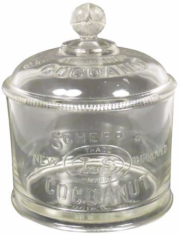 Schepp's Coconut Embossed Glass Display Jar. No chips or cracks. 7 inches tall X 5 1/2 inch diameter.