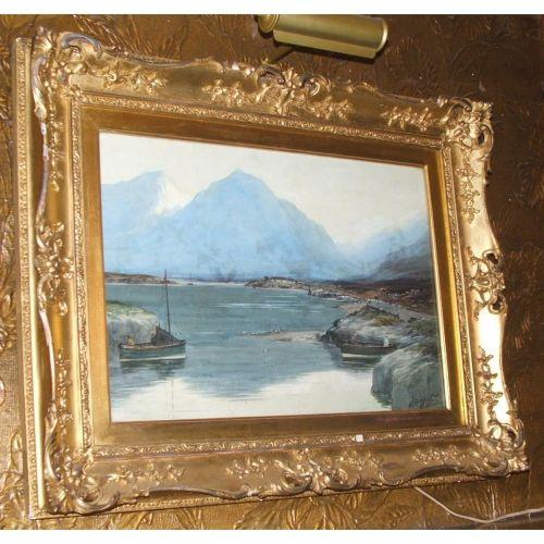 Scherllur. Unlisted, French School. Early 20th century. Watercolor on heavy paper. Signed in the lower right corner. Nice European harbor scene with a large mtn in the background. Framed in a period gilt wood frame with Rococo scroll decoration. 22" X 28"