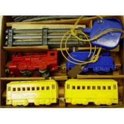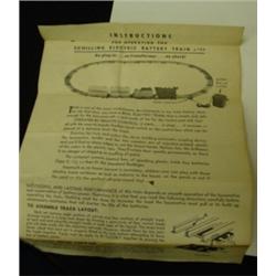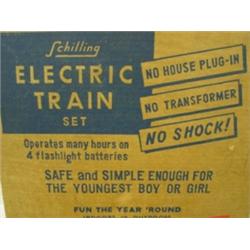 Schilling electric train set in box. Four plastic cars: red locomotive, blue coal tender and two yellow coaches. Runs on 4 "D" cell flashlight batteries. All placed in a blue case. Includes all track, instructions and original box. Condition: Very Good