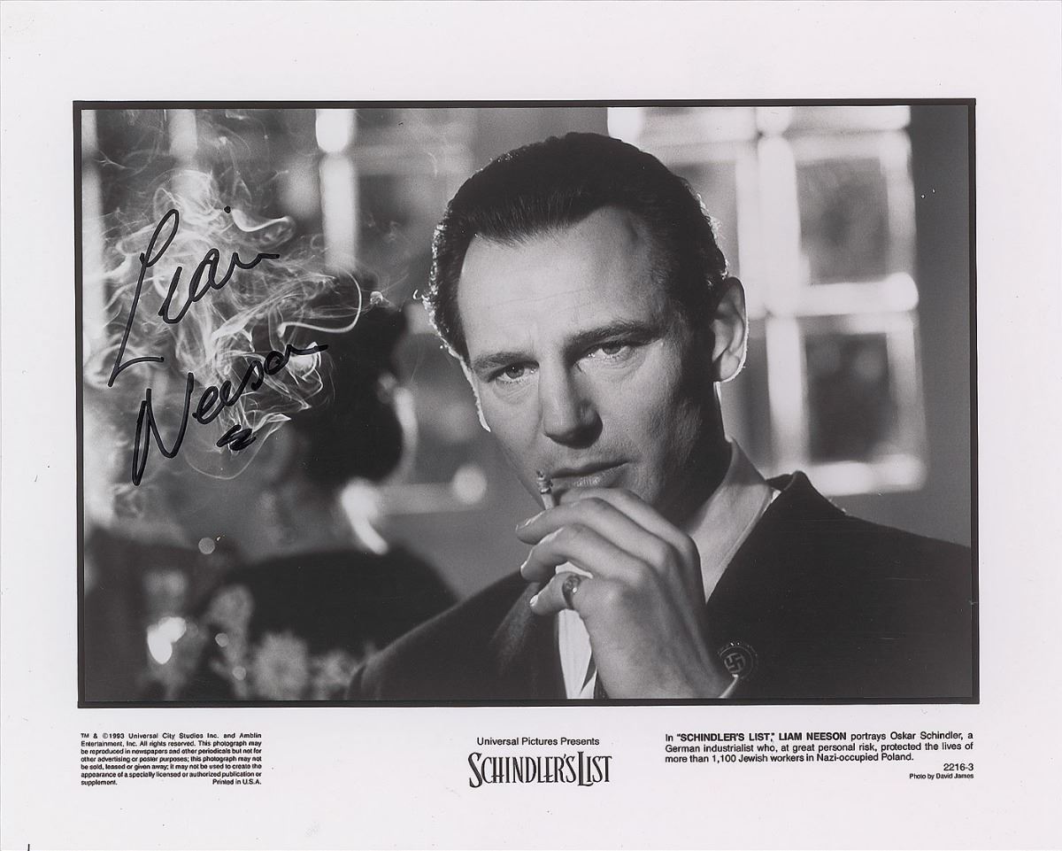 Attractive satin-finish 10 x 8 Universal Pictures publicity photo of Neeson as Oskar Schindler from the 1993 film Schindler’s List, signed in black felt tip. In fine condition.