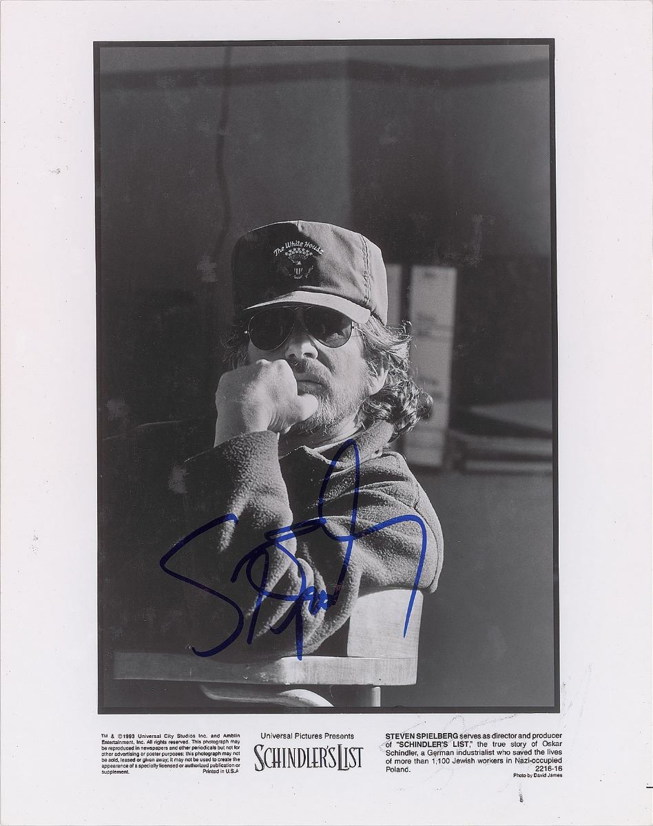 Ideal satin-finish 8 x 10 Universal Pictures publicity photo of Spielberg on the set of the 1993 film Schindler’s List, signed in blue felt tip. In fine condition, with light overall scuffing.