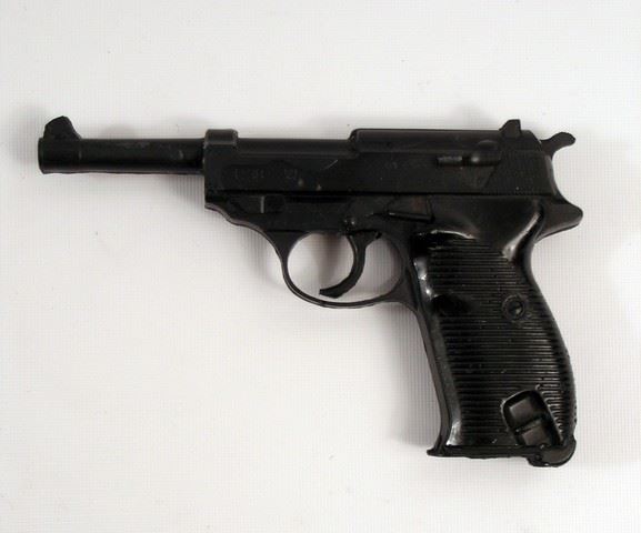 In one of the most harrowing sequences in Spielberg's masterpiece, "Schindler's List" (1993) Austrian SS-Hauptstrumfuhrer Amon Leopold Goeth (Ralph Fiennes) Goeth orders his men to dig up and then burn the bodies from the liquidation of the Krakow ghetto. If that isn't brutal enough, one of his soldier's seems to go mad and fires repeating into the mass of burning bodies. This is the stunt Walther P38 9x19mm pistol used in that sequence. Made of rubber with excellent detailing.