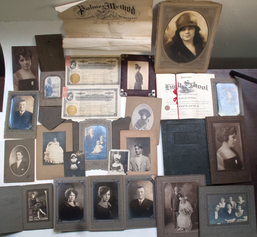 A variety of artifacts documenting the Schirmer family from Minneapolis. 17 photographs. Most of them are identified. Two are unused post cards. Many different Minneapolis photographers: Larson, Smith, Miller, Nye, and Reynolds. One Reynolds photograph is a little unusual and says patent applied for. 1929 graduation certificate and year book from Pipestone High School. 5 religious documents including 1883 confirmation document in German. Picture of Albert Erickson gravestone with two Consolidated Vermillion and Extension stock certificates made out to him in 1906. Much of the ephemera has rips and tears.City: MinneapolisCounty: HennepinState: MN