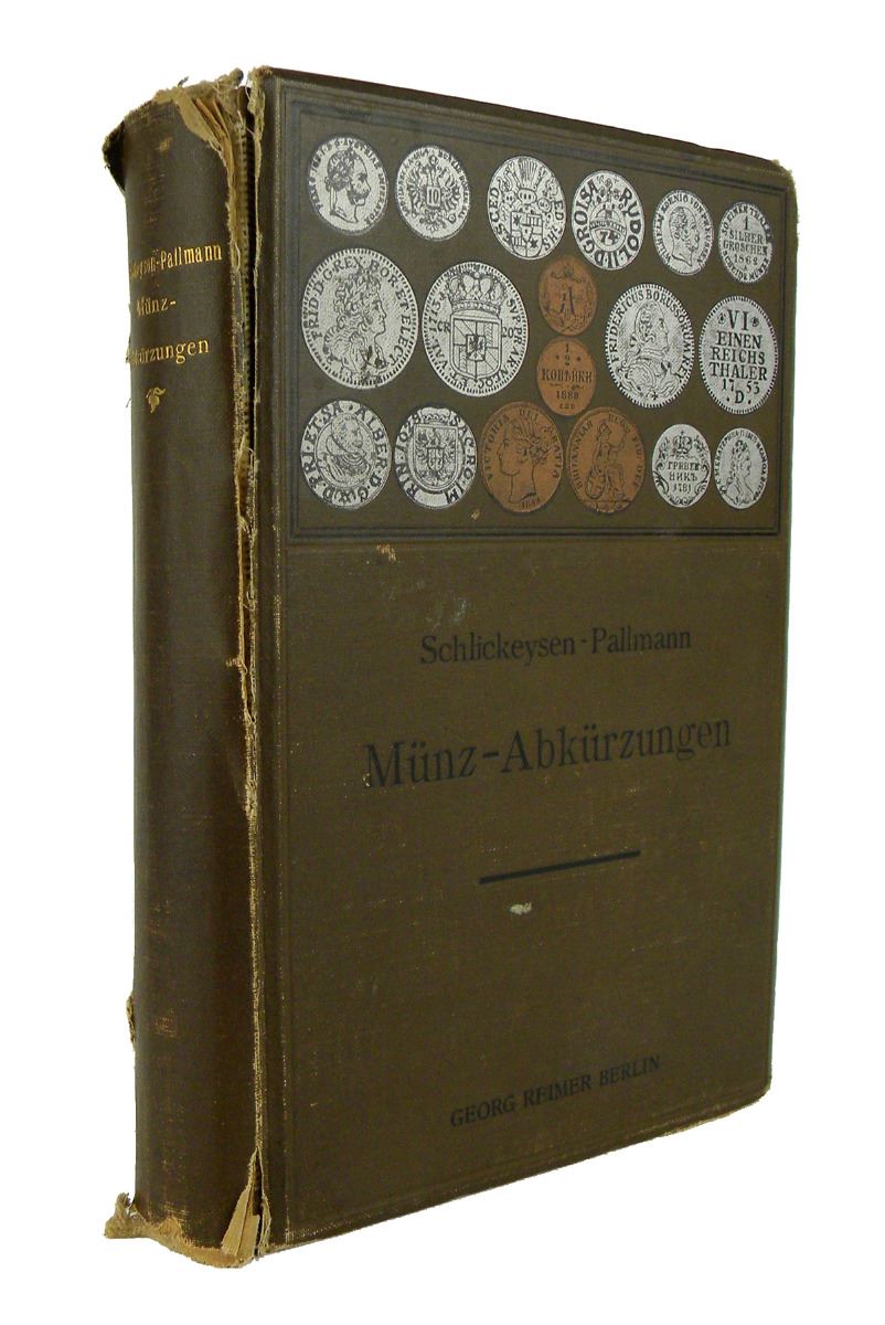Schlickeysen, F.W.A., and Reinhold Pallmann. ERKLAERUNG DER ABKUERZUNGEN AUF MUENZEN DER NEUEREN ZEIT, DES MITTELALTERS UND DES ALTERTHUMS, SOWIE AUF DENKMUENZEN UND MUENZARTIGEN ZEICHEN. Berlin & Stuttgart, 1896. Third edition. 8vo, original brown cloth, decorated in copper and silver and printed in black. viii, 512 pages; 2 plates of monograms. Spine cloth frayed at edges; very good. The best edition of this indispensable work on numismatic abbreviations, inscriptions, mintmasters, etc. Over the years, most copies have experienced heavy use. Clain-Stefanelli 285*.