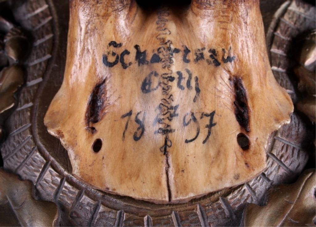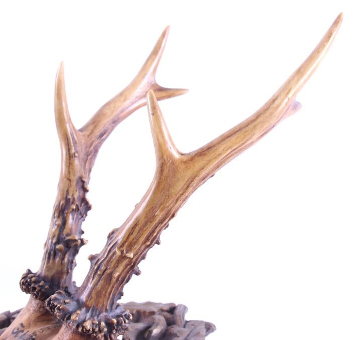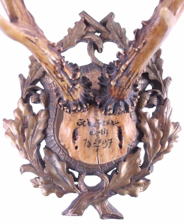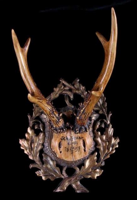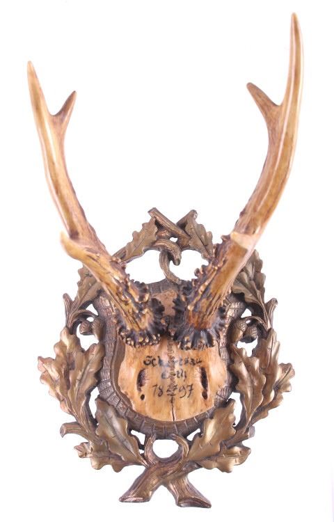 This is a roe deer mount originating from the Schloss Eckartsau, circa the 27th day of July, 1897. Schloss Eckartsau was originally constructed as a medieval fortification, and was converted to a baroque hunting lodge by Count Franz Ferdinand von Kinsky in the first quarter of the 18th century. The palace was occupied by an incredible line of Austrian dignitaries - The first owner after Count Franz Ferdinand von Kinsky was Francis Stephan von Lothringen, husband to Maria Theresa - The sole female ruler of the Habsburg Dominion. The ownership of the castle would eventually transfer to Archduke Franz Ferdinand in 1897, and after his murder, to Austria's last Imperial couple Charles I of Austria, and Princess Zita of Bourbon-Parma. The castle which stayed in ownership of the Habsburg-Lorraine house for over a century was host to many royal guests, including King Wilhelm II, the last King of Prussia, and the last Emperor or Kaiser of Germany. It was commonplace for these dignitaries to visit the palace for a hunt, and have a mount made to commemorate their trip. This mount originates from the first year of ownership of Archduke Franz Ferdinand, and possibly been taken by the Archduke himself. The mount is mounted to a gorgeous custom bronze plaque. Overall, the mount shows very-good condition. The piece measures 6 5/8" deep, 6 1/2" wide, and 9 3/4" tall.