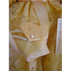 This lovely doll is approximately 18 inches . She has a porcelain head, hands and feet with a cloth body. She has long dark brown hair and brown eyes. She is dressed in a long peach lace gown with a matching hat. She is also wearing a strand of pearls. She is from the Musical Collectibles, and plays "Some Enchanted Evening". She is in excellent condition and comes in her original box.