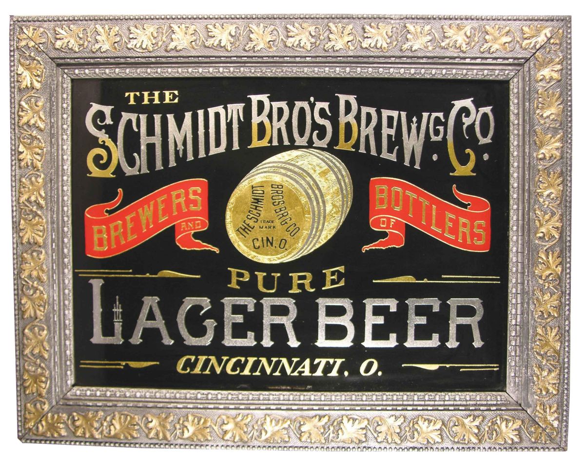 Schmidt Bro's Brew'g Co. Reverse Glass Sign in original frame. Brewers and Bottlers, Pure Lager Beer, Cincinnati, O. Made by the Hope Co., Cincinnati, OH. Excellent condition. 35 X 27 1/2 inches overall.