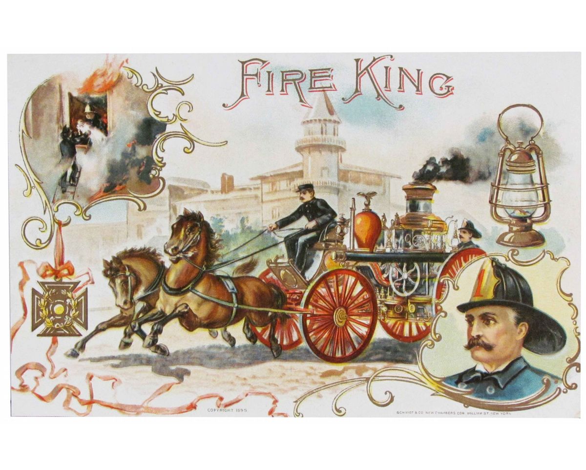 Schmidt & Co. Litho "Fire King" Cigar Label. Depicts fire pumper, fire rescue, lantern and Malaysian Cross and Fire helmet. Copyright 1895. Excellent color and graphics, near mint condition. 7 X 4 1/2 inches.