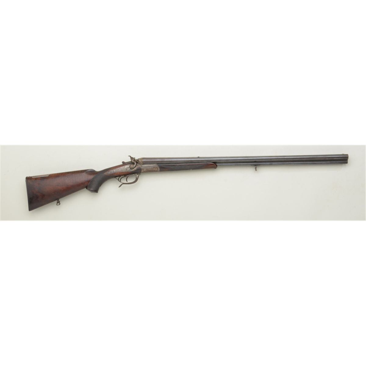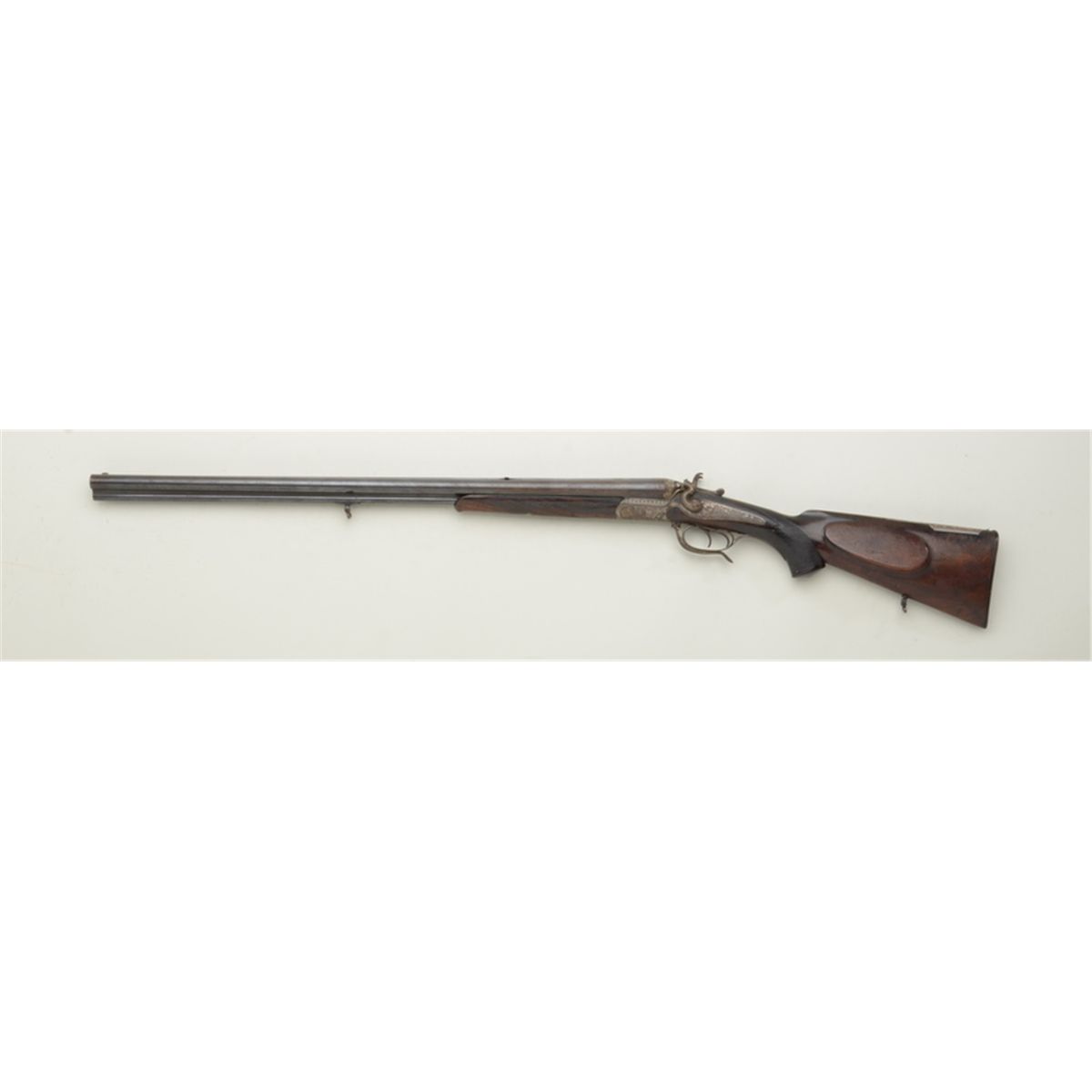 Schmidt & Haberman Drilling combination shotgun/rifle, circa 1910 to 1930, 16 gauge over 8.8mm cal., 27-1/2” barrels, blue and case hardened finish, checkered wood stocks, sling swivels, bullet trap on top of buttstock, #18023. This gun is in overall very good to fine uncleaned condition showing considerable muted blue finish on barrels with balance gone to a brown patina, engraved game scenes on frame that shows silverytoning to the case hardening; bores should clean to very good +, actions are crisp, wood stocks are overall very good with some old mars and scratches from storage; horn butt plate shows some loss to top from worming. A really high grade drilling for its time and should clean up nicely with a little TLC. Est.: $650-$1,300.