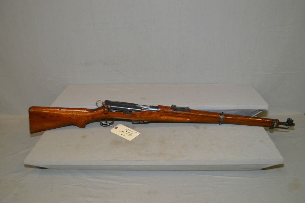 Schmidt Rubin Model 1911 7.5 x 55 Cal Full Wood Military Straight Pull Bolt Action Mag Fed Rifle w/ 23" bbl [ blued finish, barrel sights, matching numbered bolt & mag, left side sling swivel, good varnished wood, w/ rifle hanger & bayonet lug ] Ser # 161468