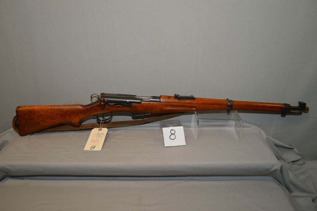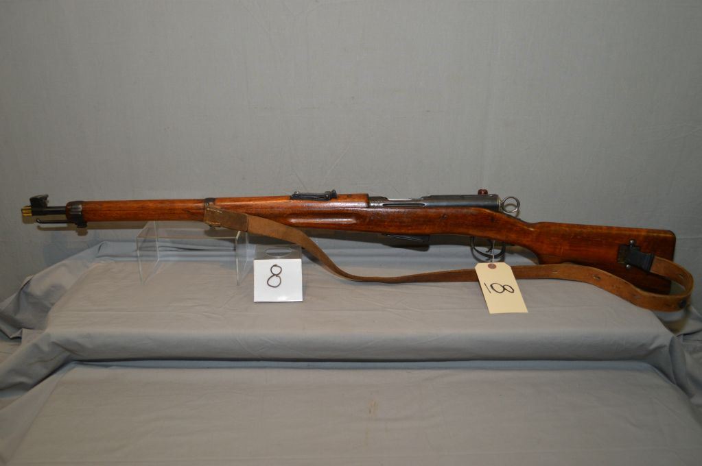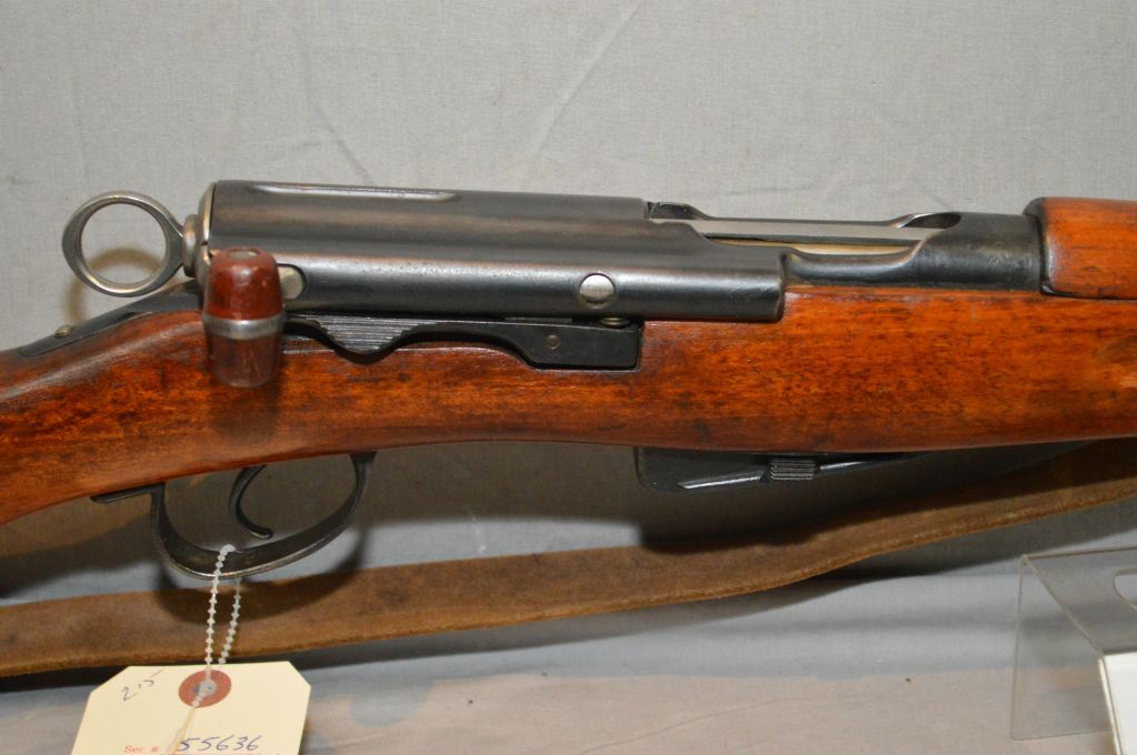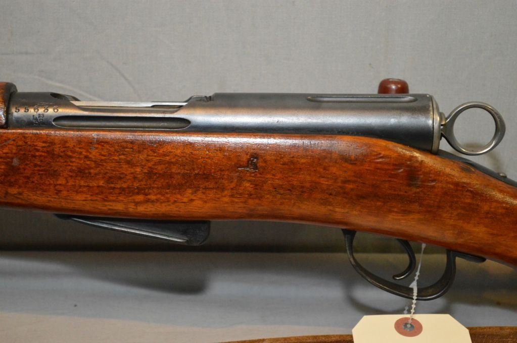 Schmidt Rubin Model 1911 7.5 x 55 cal ? Straight Pull Mag Fed Bolt Action Full Wood Military Rifle w/ 23" bbl [ blue finish, good wood, matching numbered mag & bolt, w/brass & iron muzzle cover, w/ leather sling ] Ser # 55636