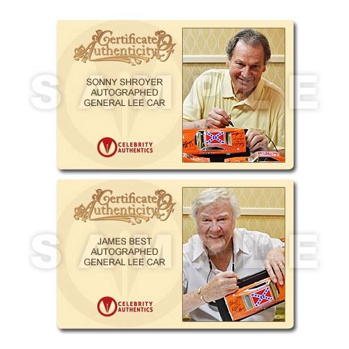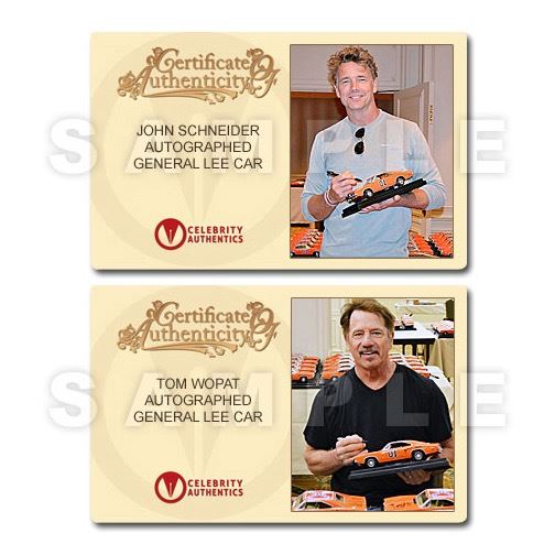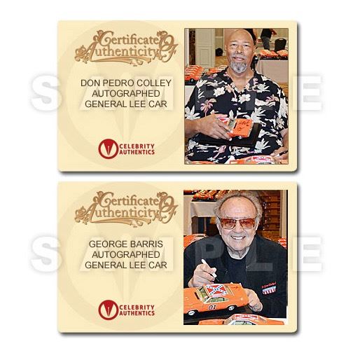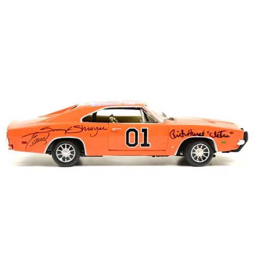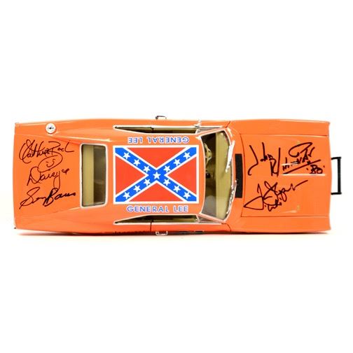 This 1:18 scale General Lee Die-Cast Car from the classic 1980's TV series The Dukes of Hazzard has been personally hand-signed by cast members John Schneider (Bo Duke), Tom Wopat (Luke Duke), Catherine Bach (Daisy Duke), the late James Best (Sheriff Rosco P. Coltrane), Sonny Shroyer (Deputy Enos Strate), Rick Hurst (Deputy Cletus Hogg), Don Pedro Colley (Sheriff Little) and the car's creator, George Barris with each adding their character names during their signings with Celebrity Authentics. Made in stunning detail with exceptional craftsmanship, this museum piece is ready to display and become the focal point of your collection! Car will ship affixed with the Celebrity Authentics serial-numbered and tamper evident Authentication Hologram and includes Celebrity Authentics Certificates of Authenticity featuring a picture of the talent signing the car. Stock image used for product images. Item ships with clean, unsmudged autograph in similar location.
