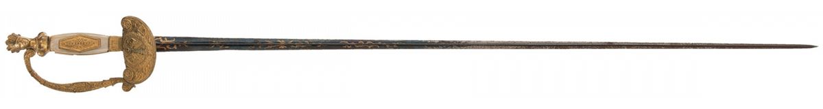 Produced in Solingen, Germany. Measuring 37 3/4 inches overall, with a 32 1/2 inch triangular profile blade, finished in niter blue with gold accents on the lower half, decorated with scroll and martial designs, and marked "S&K" on the ricasso. Gilt finished hilt, with a crossed flag design on the counterguard, "LIBERTAD" plaque on the mother of pearl grips and a native princess bust pommel. No scabbard is included.