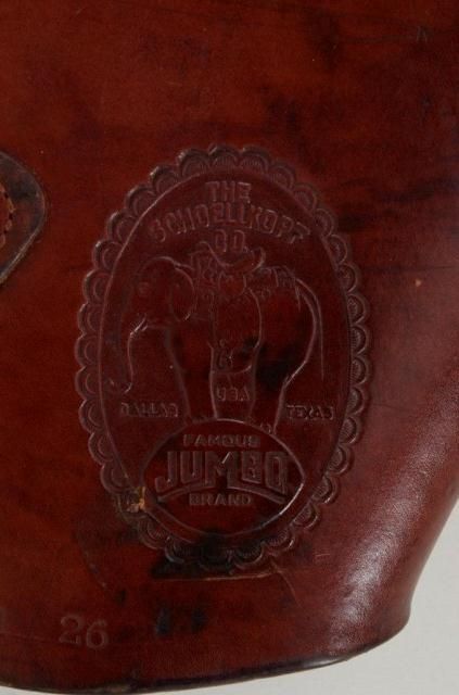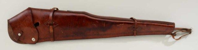 Schoellkopf “Jumbo” brand tooled leather scabbard for a bolt-action rifle in overall very good + condition made of heavy leather with attaching straps remaining; a famous Dallas, Texas maker. Est.: $125-$250.
